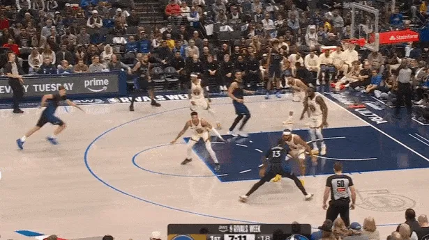 紧接着继续乘胜追击,过半场后立即起速并发动“Drag Screen”点名库里,行进至三分线使用小跳步后立即二次加速直杀篮下,过掉库里后顶着霍福德回收护框上篮打进。