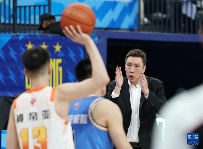 1月13日,北京北汽队主教练许利民(前右二)在比赛间隙布置战术。