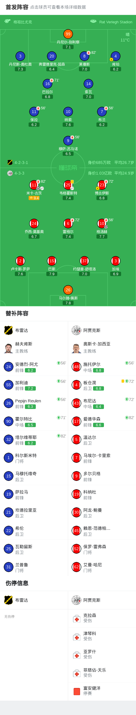北京时间4月26日荷兰甲级联赛 联赛 第31轮,布雷达主场对阵阿贾克斯。阿贾克斯格洛赫破门,米卡-古茨破门。最终比分布雷达 0-2 阿贾克斯。